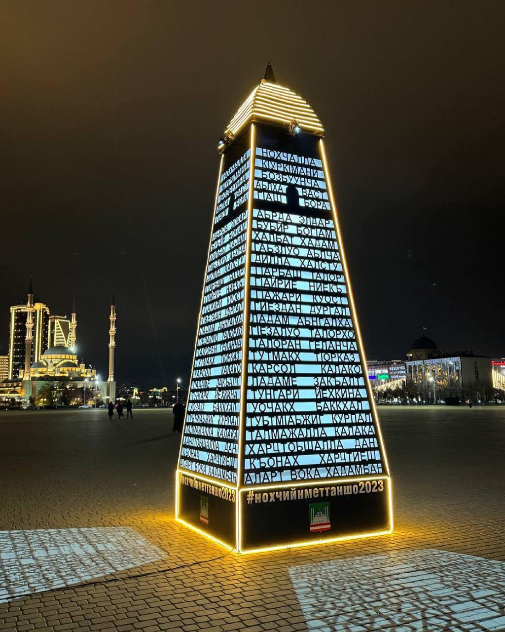 На центральной площади города имени А.Ш. Кадырова представлена уникальная чеченская башня. Ее украшают слова, которые восходят своей историей к древним временам чеченского народа.